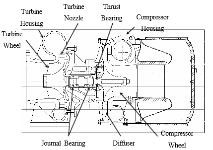 The above T- AT14 Turbocharger's cross-sectional drawing shows that the T-AT14 turbocharger is consisted of the turbine and compressor, and the thrust bearing and two journal bearings which make the axial and radial forces respectively becoming possible. From static section view, T-T- T- AT14 turbocharger consists of the compressor housing, bearing housing and turbine housing.